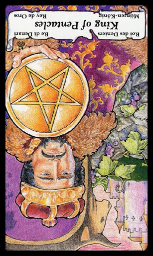 The King of Pentacles uses his Earthly attributes to rule. He goes about his work like an old style business man; he avoids unnecessary risks, aims for real results, and acts from confidence.