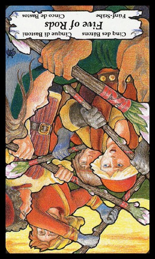 The 5 of Wands represents competition. The 5 is the second assignment number, and therefore a difficult card. 5 combined with the Wand's element fire challenges you. You'll have to fight hard for your idea, but you stand a good chance of succeeding.