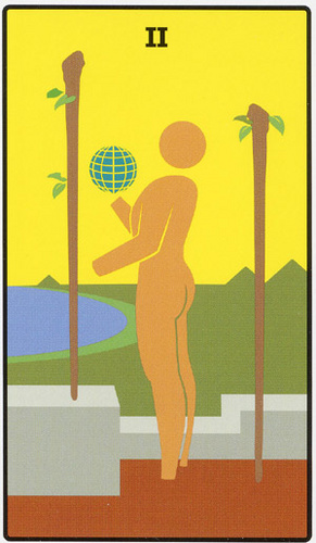 The 2 of Wands represents the research and digestion of a new idea. The number of this card and it's element are somewhat in conflict; while the 2 is focussed inwards, the Wand's element fire is outgoing. Fire wants to steam ahead while the blackbox 2 asks for patience.