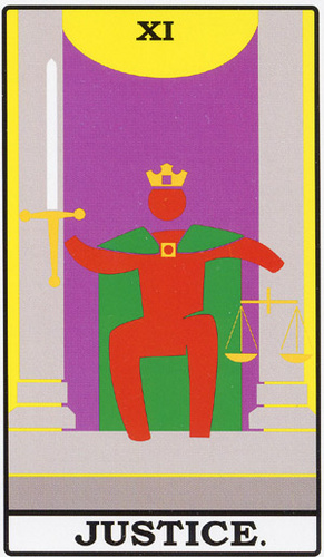 This card carries the number 11. In the Rider-Waite deck, Strength and Justice have swapped places because Waite saw links with the astrological signs Leo and Libra.