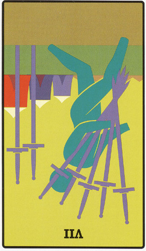 The 7 of Swords is about making slow progress because you can't trust the situation and/or people around you.