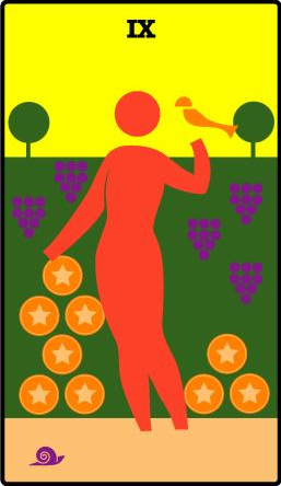 The 9 of Pentacles represents earned rest. The element Earth, attached to the Pentacles suit, appreciates the rest that completion of hard work brings. This is a good time for games and relaxation.