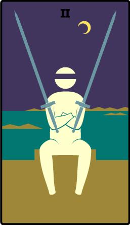 The 2 is an assignment number in tarot, and in this case of the 2 of Swords, it's about being forced to wait for something, often even while blindfolded in some sense.