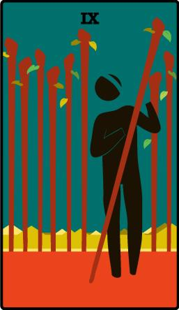 The 9 represents rest after work, which is another thing (like 8) that the element Fire associated with Wands is not very comfortable with. Fire likes to keep going. This rest will probably be spent thinking about what to do next along the course to completion.