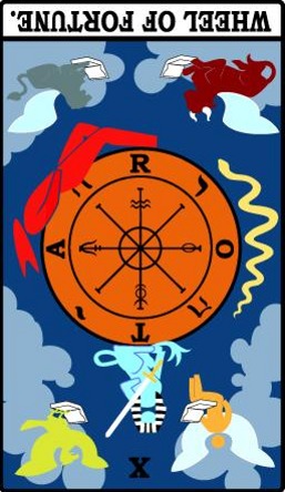 With the Wheel of Fortune, the second major cycle of Tarot commences. The first cycle in the first cards of the deck was about development as a child, accumulating wisdoms and integrating them into your personality. This second cycle is about your development as an adult. It is a more demanding cycle. You'll have to see if you can face what the world throws at you.