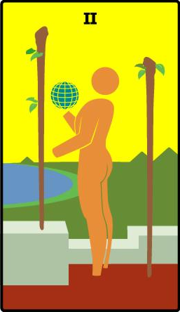 The 2 of Wands represents the research and digestion of a new idea. The number of this card and it's element are somewhat in conflict; while the 2 is focussed inwards, the Wand's element fire is outgoing. Fire wants to steam ahead while the blackbox 2 asks for patience.