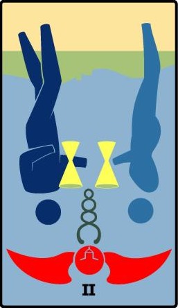This the first assignment number of the Cups suit. Unlike Wands, with the Fire element, Cups, with the water element, has a lot more patience. Water is by nature more introspective, and this second card in the Cups suit is indeed about exploring yourself. The outcome is uncertain as always, but it usually results in better acceptance of yourself.