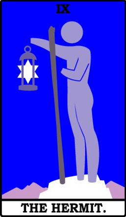 The Hermit shuts out the world and retreats into solitude to better understand some spiritual aspect of life. He opens to the cosmos and lets it's wisdom sink in. Hermits are often seen as wise old men who can guide a traveller along a journey.