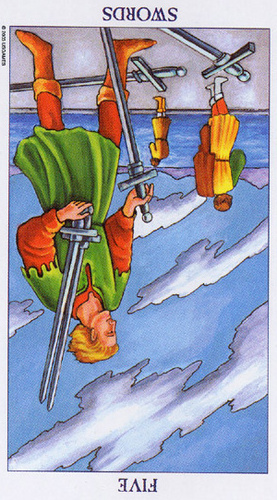 The 5 of Swords is about facing reality. The 5 is an assignment number, and in the slighly more difficult suit of Swords, it means you face a difficult challenge where your past experiences could hold you down.