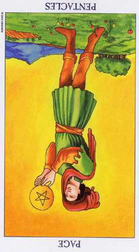 Pages explore and gather information about the road ahead, with an almost naive attitude. The Page of Pentacles is sometimes described as a bridge builder; Pentacles is the suit where the actual work is done, and the Page here enables those that follow to quickly cross difficult terrain.