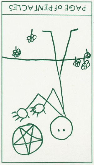 Pages explore and gather information about the road ahead, with an almost naive attitude. The Page of Pentacles is sometimes described as a bridge builder; Pentacles is the suit where the actual work is done, and the Page here enables those that follow to quickly cross difficult terrain.