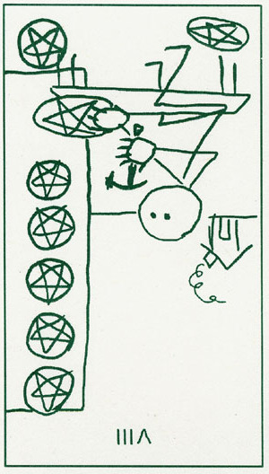 The 8 of Pentacles is about keeping up the hard work you're doing, and trying to be happy about doing that work at the same time. While the 3 of Pentacles is about completing a masterpiece, the 8 of Pentacles is about doing the apprentice work that makes you a master of your trade.