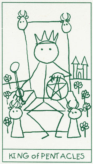 The King of Pentacles uses his Earthly attributes to rule. He goes about his work like an old style business man; he avoids unnecessary risks, aims for real results, and acts from confidence.