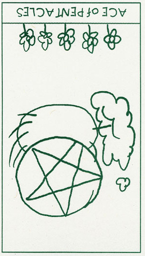 When this card falls, it might serve to point your attention to whatever is new and fresh in your life; a new job, study, love relation, business relation, project, etc. Look to the other cards in the reading to see what more can be said about it.