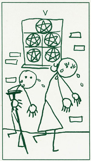 The 5 of Pentacles is an assignment-number card, and is about letting go of your securities. Pentacles element Earth (also) represents material posessions, so this card is about letting go of (some of) your worldly assets.