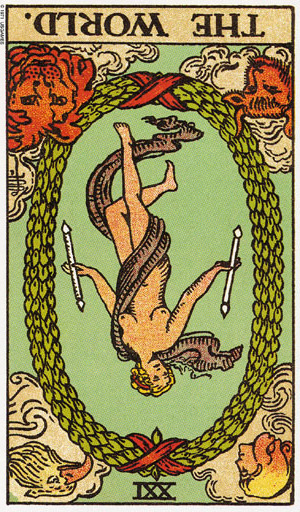 This card falls when you've completed all assignments, overcome all obstacles and are completely at peace with yourself due to your accomplishments. Yet Tarot wouldn't be Tarot if it didn't challenge you to enter entirely new worlds and start the process all over again.