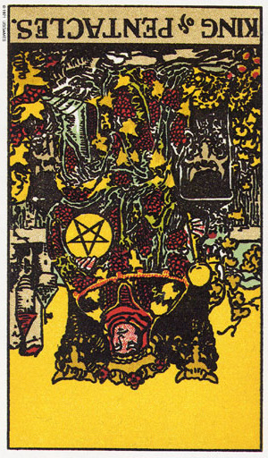 The King of Pentacles uses his Earthly attributes to rule. He goes about his work like an old style business man; he avoids unnecessary risks, aims for real results, and acts from confidence.