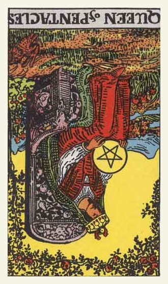 The Queen in the suit of Pentacles becomes aware of her Earthly attributes; she's reliable and sober, able to give good advice.