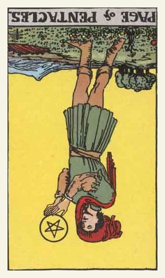 Pages explore and gather information about the road ahead, with an almost naive attitude. The Page of Pentacles is sometimes described as a bridge builder; Pentacles is the suit where the actual work is done, and the Page here enables those that follow to quickly cross difficult terrain.