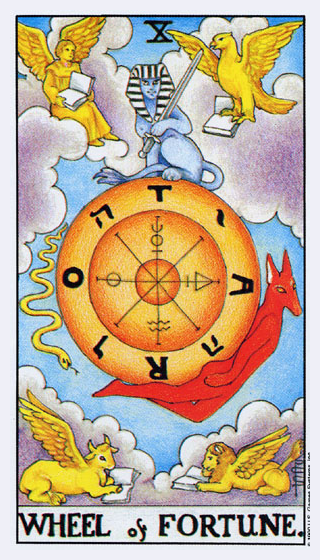 With the Wheel of Fortune, the second major cycle of Tarot commences. The first cycle in the first cards of the deck was about development as a child, accumulating wisdoms and integrating them into your personality. This second cycle is about your development as an adult. It is a more demanding cycle. You'll have to see if you can face what the world throws at you.