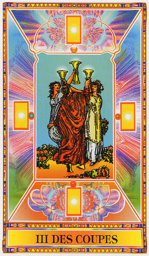 The 3 of Cups represents hope, faith and love. The 3 is a reward number and in this suit of Cups your feelings during that number will be that of joy and self-contentment.