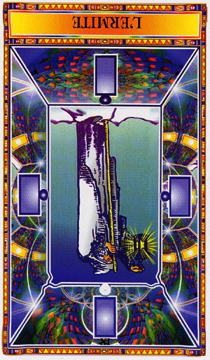The Hermit shuts out the world and retreats into solitude to better understand some spiritual aspect of life. He opens to the cosmos and lets it's wisdom sink in. Hermits are often seen as wise old men who can guide a traveller along a journey.