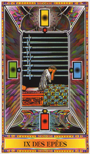The 9 of Swords represents relief from cropped-up grief. The number 9 is a number of reward and rest and accomplishment. In the element of Swords there is not a lot of time for rest, but without any rest you'd just burn yourself out.