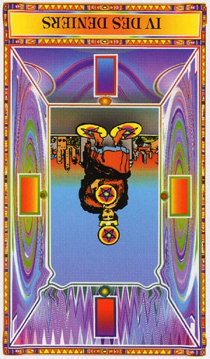 The 4 of Pentacles is about holding on to what you got. The number 4 represents structure and order, and fits well with the suit's element, Earth.
