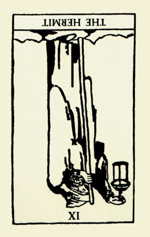 The Hermit shuts out the world and retreats into solitude to better understand some spiritual aspect of life. He opens to the cosmos and lets it's wisdom sink in. Hermits are often seen as wise old men who can guide a traveller along a journey.