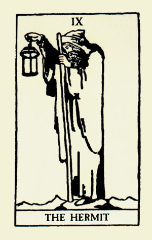 The Hermit shuts out the world and retreats into solitude to better understand some spiritual aspect of life. He opens to the cosmos and lets it's wisdom sink in. Hermits are often seen as wise old men who can guide a traveller along a journey.