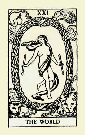 The World carries the number 21. As a composed number that is 3. The World is the third 3 in the Major Arcana. 3 is a reward number, so the third 3 must be even more powerful.